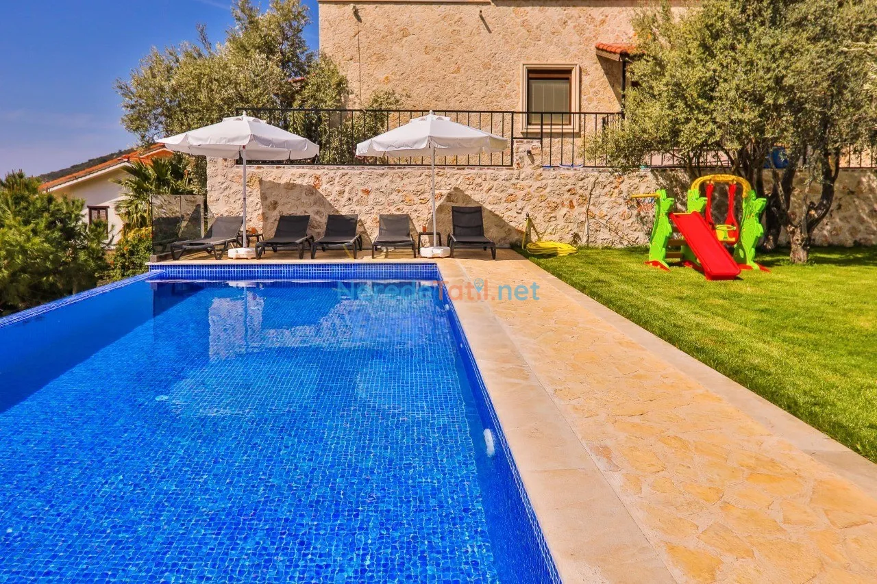 Villanın geniş özel yüzme havuzu, 4 metre genişliğe, 9 metre uzunluğa ve 1.55 metre derinliğe sahiptir ve rahatlatıcı bir yüzme deneyimi sunar. Çocuk havuzu ise 2x2 metre boyutlarıyla küçük misafirler için güvenli bir eğlence alanı sunmaktadır. Havuz başında güneşlenirken, Kızıltaş'ın doğal güzelliklerinin tadını çıkarabilirsiniz.