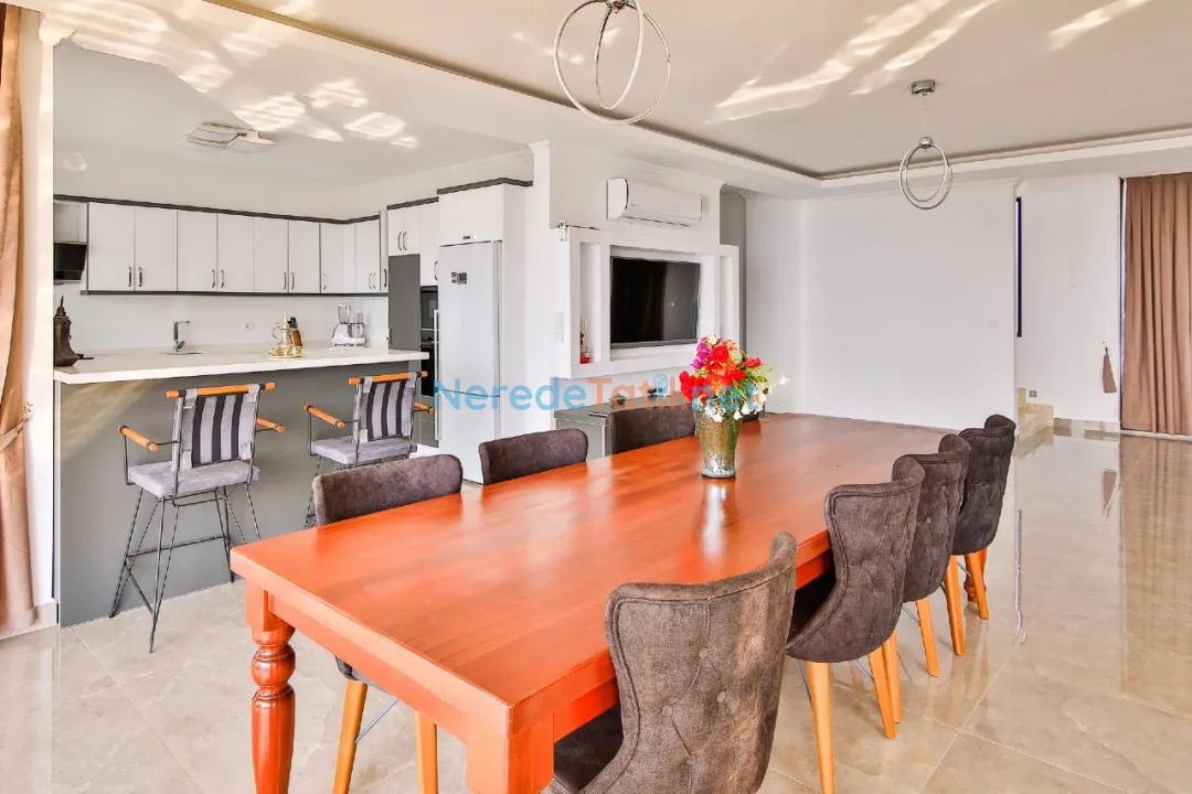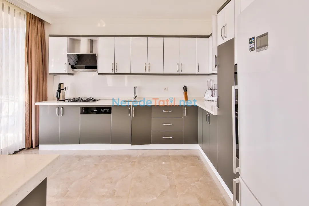 Villamızın alt katında geniş ve kullanışlı bir Amerikan mutfak ile ferah bir oturma alanı bulunmaktadır. Mutfak, tatil süresince ihtiyaç duyabileceğiniz tüm ekipmanlarla donatılmıştır: