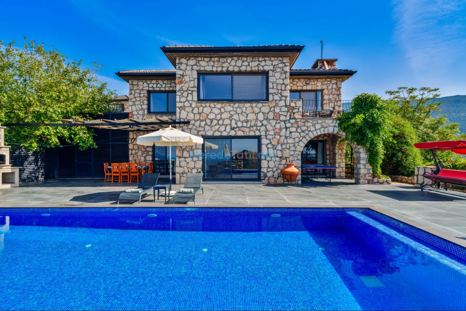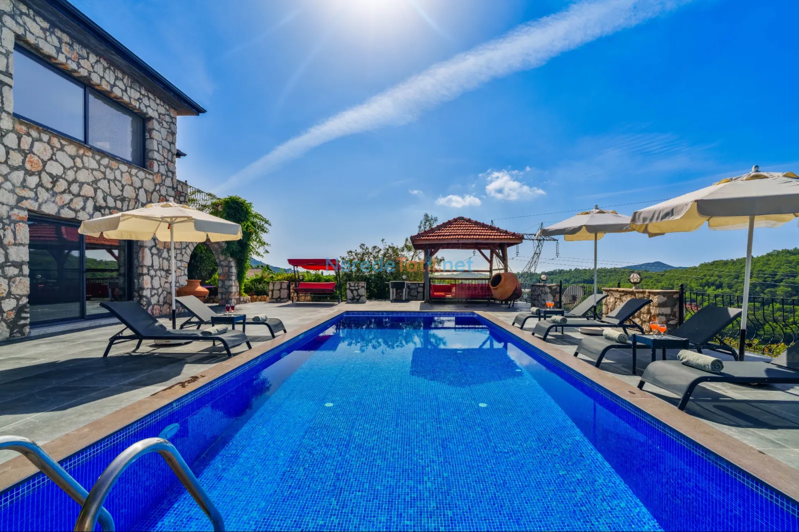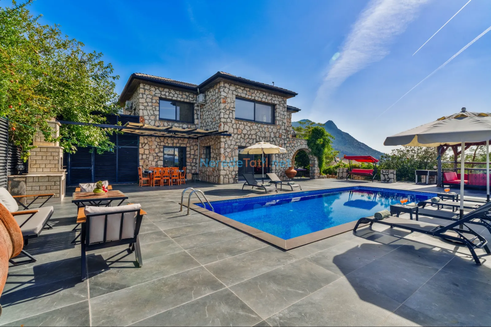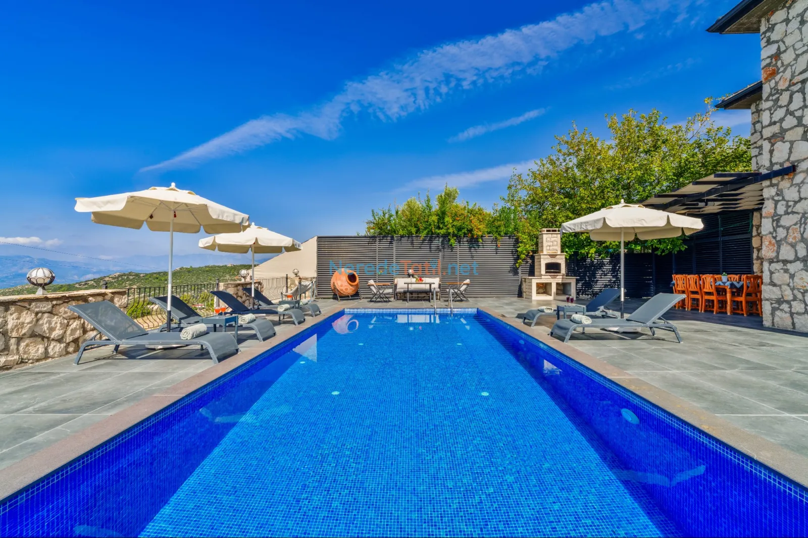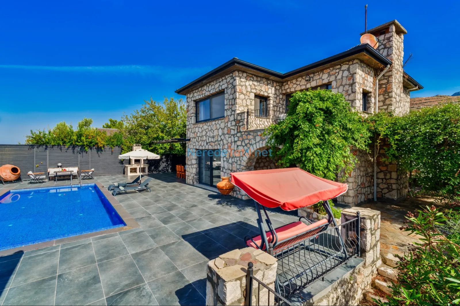 Villanın dikkat çekici özelliklerinden biri de özel yüzme havuzudur. Havuz 4,5 metreye 9 metre boyutlarında ve 1,86 metre derinliğindedir. Havuzda keyifli vakit geçirirken, doğanın tadını çıkarabilirsiniz.