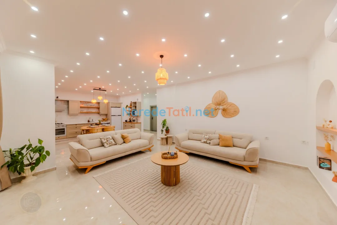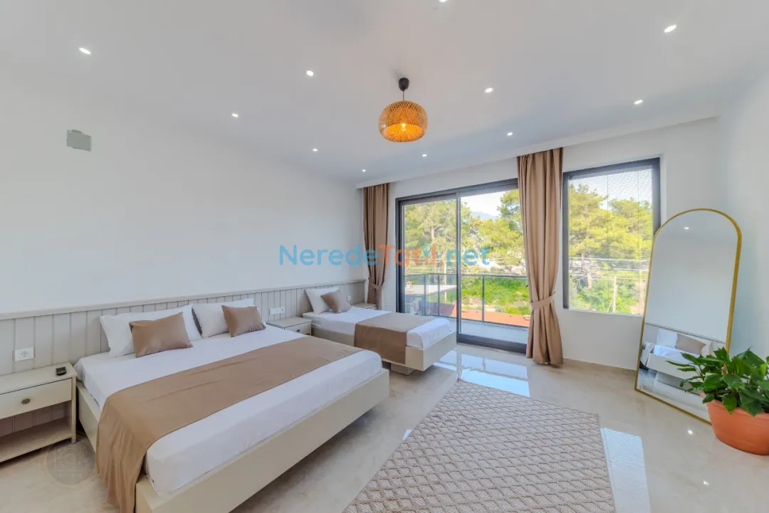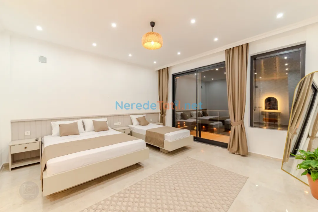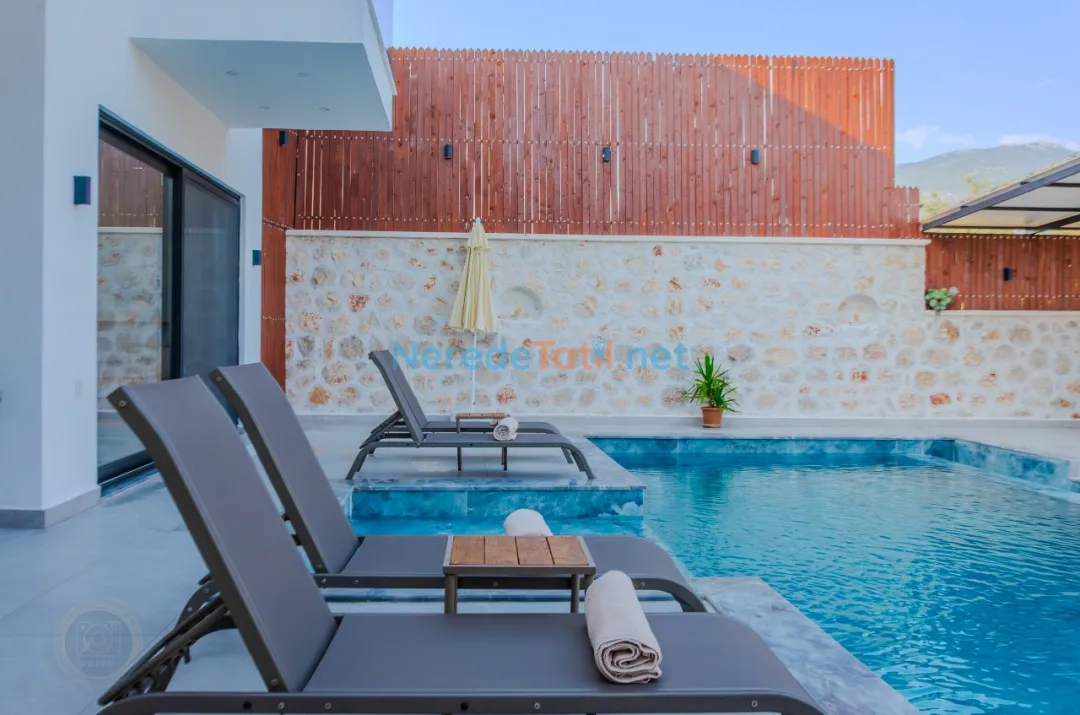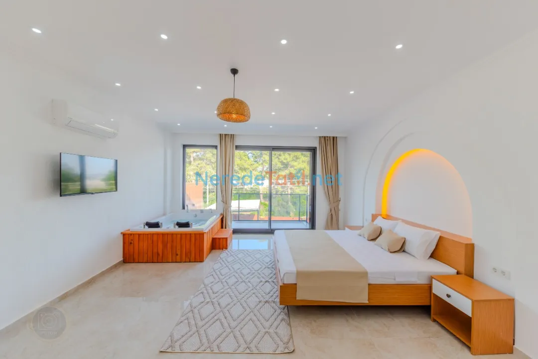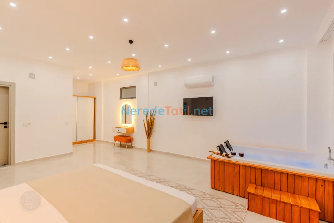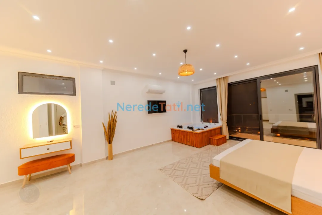 Kınık'ın huzur dolu atmosferinde, özel havuzlu ve jakuzili bu lüks villa, unutulmaz bir tatil sunuyor. Muhafazakar tatilciler için ideal olan bu mekanda, korunaklı havuz sayesinde gönül rahatlığıyla yüzmenin keyfini çıkarabilirsiniz. Modern tasarımıyla dikkat çeken villada iki çift kişilik yatak ve bir tek kişilik yatak bulunan toplam iki yatak odası ve üç banyo mevcuttur.